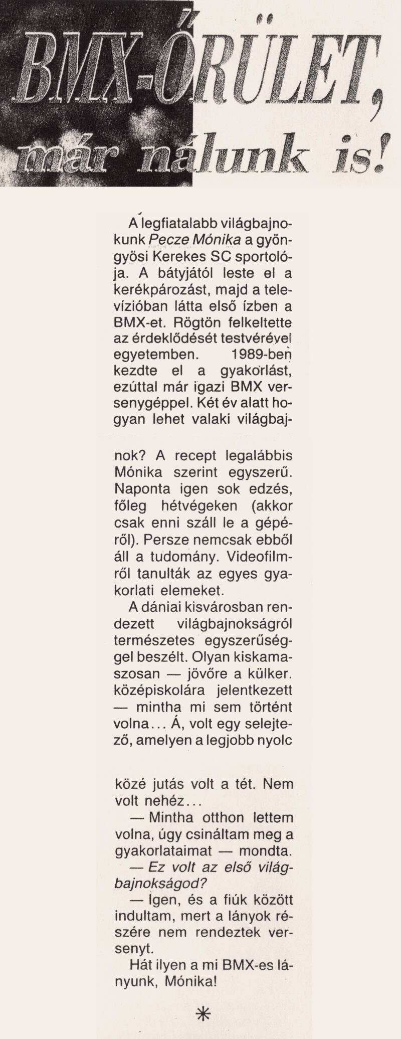 “Her freestyle routine lasted exactly two minutes — we checked it countless times beforehand, stopwatch in hand,” explained her BMX-mom, known in civilian life as Mrs. József Pecze.